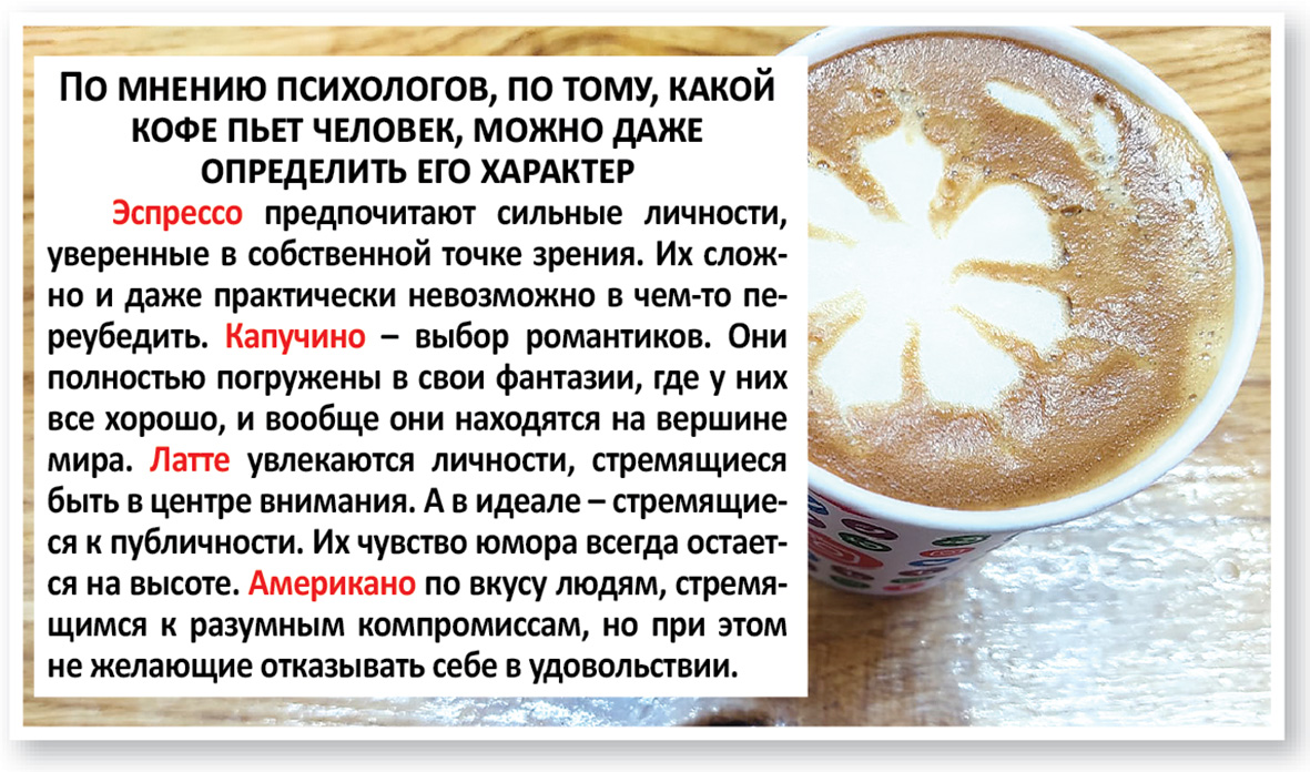 — Да, есть такое. В основном мужчины предпочитают сладенький кофе: больше сахара, сиропы, зефир, это «латте» и «мокачино». А женщины пьют крепкий, без сахара и добавок.