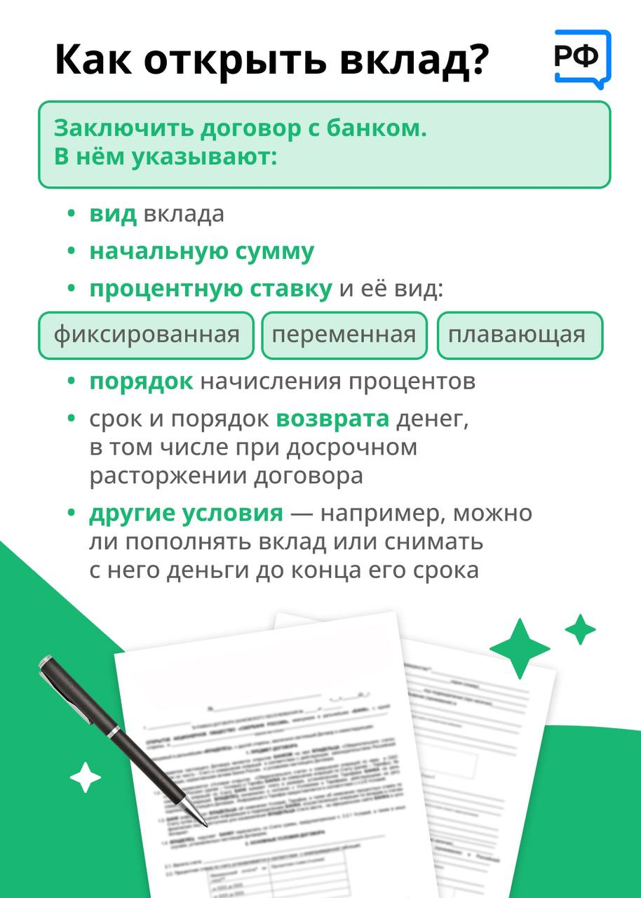 Каждый банк предлагает несколько вариантов открытия вклада. Каждый житель может лично посетить отделение банка, либо дистанционное узнать о вкладе на официальном сайте и в мобильном приложении банка. В личном кабинете нужно перейти в раздел «Вклады», выбрать опцию «Открыть вклад» и оформить депозит и перечислить денежные средства.