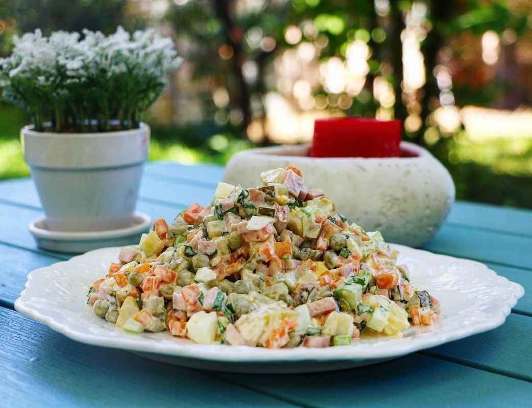 Так, в стандартный рецепт 800 грамм входят 200 граммов колбасы, 150 граммов картофеля, 70 граммов моркови, 80 граммов огурцов — свежих или соленых, 120 граммов горошка, два яйца, 80 граммов майонеза, соль, перец и зелень по вкусу.
