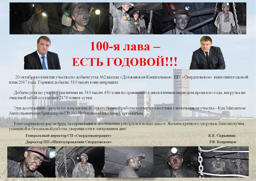 Как подчеркнул директор шахтоуправления "Свердловское" Роман Бояринцев, эти достижения – результат напряжённой, ответственной работы коллектива во главе с начальником участка Михаилом Куцем и бригадиром горнорабочих очистного забоя (ГРОЗ) Николаем Чубуковым.