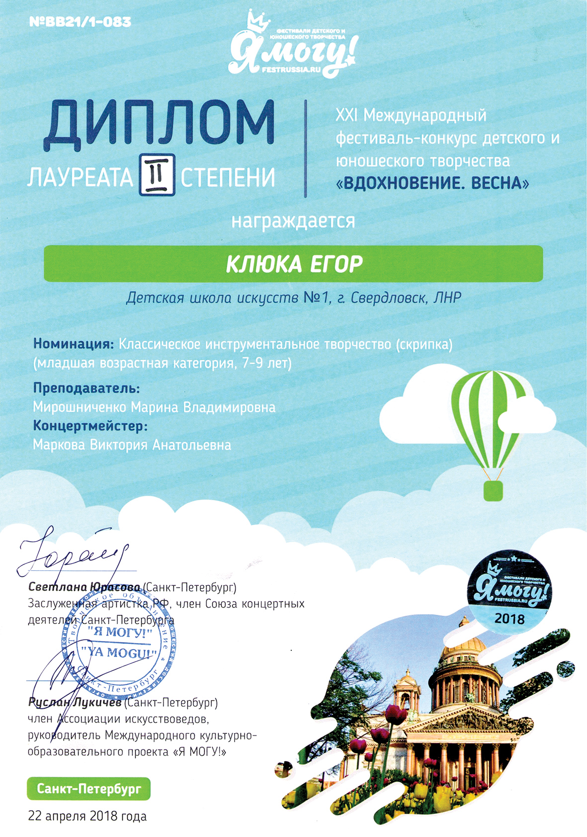 Туда приехало много участников из Украины, Республики Беларусь, России, ДНР, а вот из ЛНР один Егор, который в итоге занял 2 место. Хотя его соперниками были воспитанники музыкальных десятилеток, где у них в приоритете сначала музыка, а потом все остальное. Мы были рады просто посмотреть на этих детей и их исполнение, поучаствовать и пройти в первый тур. Он старался, у него хорошая эстрадная выдержка. Он не «ботан» и не «заучка», а обычный мальчишка, как все. Когда услышали, что он занял призовое место не поверили в такое счастье! Каждый раз перед выходом на сцену я ему напоминаю, что он должен выложится на все 100%, и выполнить эту работу достойно. Не воображать, а радовать людей своей музыкой. Стараюсь, чтобы он в этот день себя чувствовал комфортно: выспался, покушал вкусненького, т.к. если он голоден это будет кошмар! Тогда настроения нет и желания играть тоже.