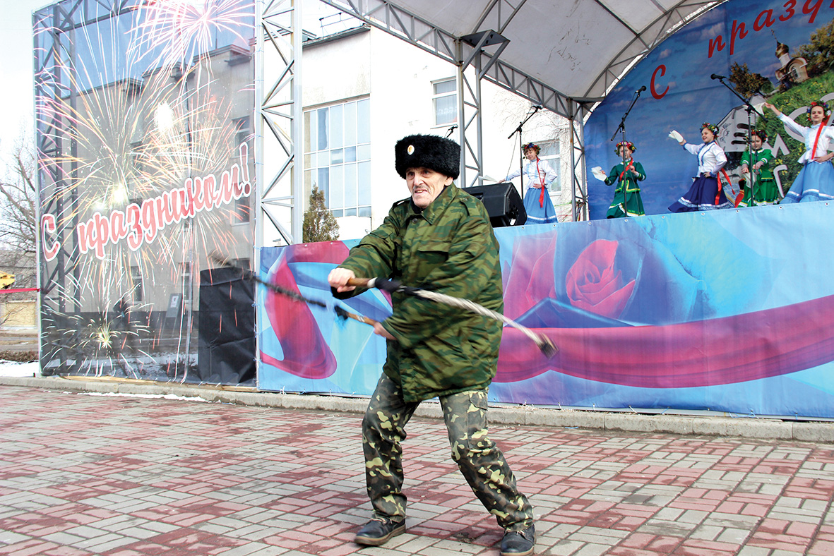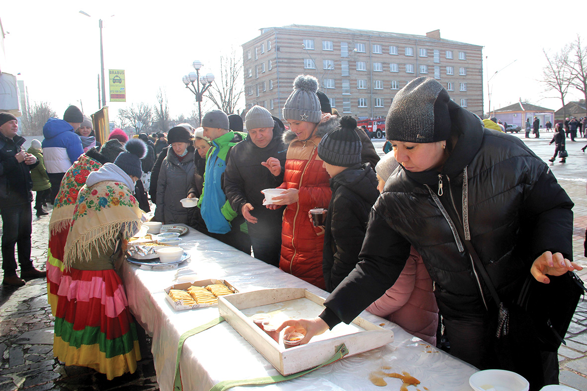 Около дворца стояли столики, где всем желающим предлагали блинчики и травяной чай. Очередь здесь выстроилась очень быстро, ведь желающих отведать праздничное угощение было немало. Невозможно было не ощутить и аромат кулеша, который готовили казаки Должанского юрта Луганского округа Всевеликого войска Донского. Они также предлагали чай и блины. А тем временем на площади готовили шашлык и другие угощенья.
