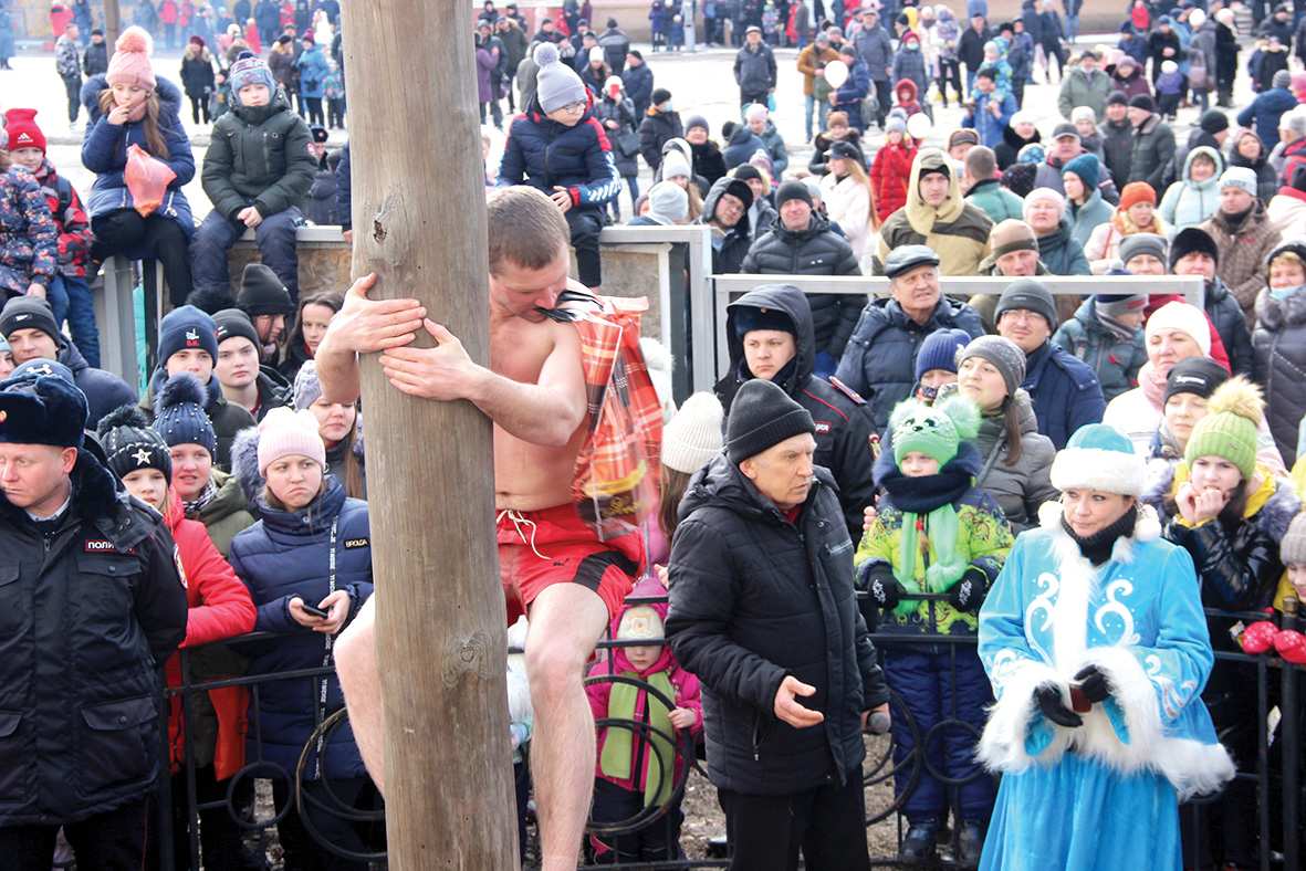 По традиции после этого все дружно отправились к столбу ловкости, где молодые люди уже выстраивались в очередь, чтобы показать свою силушку богатырскую. И продемонстрировать, как быстро они смогут взобраться на самый верх. Однако ожидания были оправданы далеко не у всех. Ведь как всегда, столб смазывают маслом, чтобы усложнить задачу. Первым был улыбчивый молодой человек, он так старался взобраться наверх, но у него ничего не получилось, второй смог подняться выше, но буквально в метре от вершины не удержался и спустился вниз. Неудача постигала и других участников. Зрители же старались поддерживать всех: хлопали, кричали и свистели. А следующий парень очень уверенно двигался к подаркам, забрался на самый верх и спустился с пакетом. Встречали его внизу оглушительными овациями. Первый победитель придал уверенности другим ребятам, и их азарт только усилился. И вот все четыре пакета оказались в руках самых сильных и ловких. Некоторые даже старались позировать на камеру. Неудивительно, ведь оказаться лучшим среди такого количества конкурентов, причем, даже тех, у кого спортивное телосложение, не может не порадовать. После этого были вывешены еще четыре пакета, которые также впоследствии удалось достать. У тех, кто раздевался до нижнего белья, на груди оставались царапины от лазанья по столбу. Медработники оперативно оказывали помощь всем, кому она требовалась.