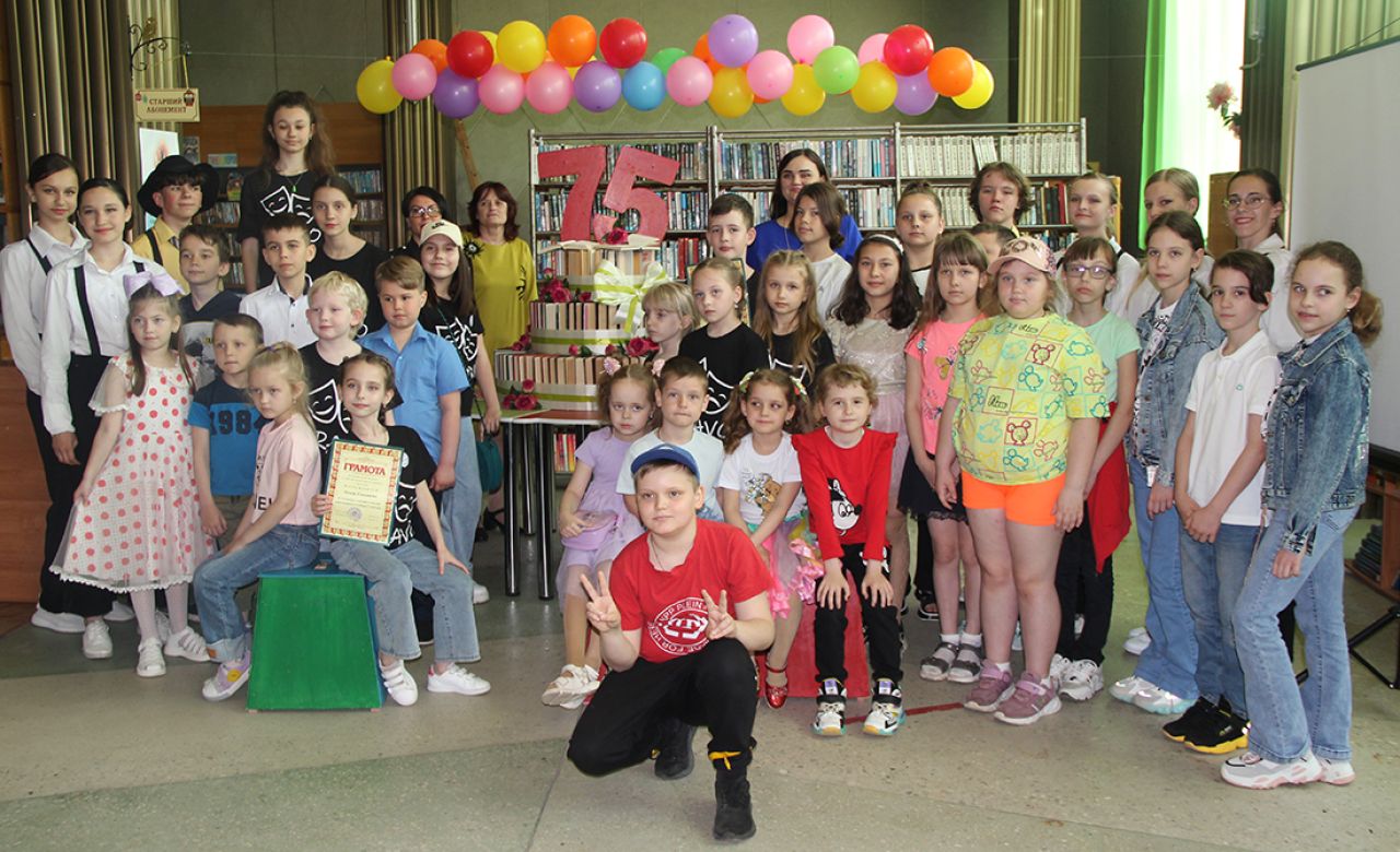 В зале библиотеки был установлен огромный торт... из книг. Его вершину венчала цифра 75. Возле необычного торта стремились сфотографироваться гости праздника. Во время праздничной программы свои выступления гостям и юным читателям демонстрировали воспитанники театральной студии «Браво» и танцевального коллектива «Вива».