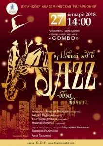 14:00 концерт ансамбля эстрадной и джазовой музыки «Combo» «Новый год в джазовых тонах». Руководитель – Алексей Лисицын. С участием лауреата международных конкурсов Маргариты Колгановой и Виктории Рыбалкиной. Луганская академическая филармония.