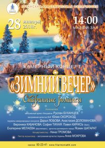 14:00 (малый зал) камерный концерт «Зимний вечер» (старинные романсы). С участием ведущих солистов филармонии. Лектор-музыковед – заслуженная артистка Украины Анна Мокрова. Луганская академическая филармония.