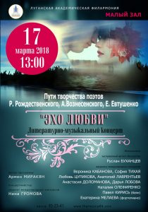 17 марта в 13:00 – (малый зал) литературно-музыкальный концерт «Эхо любви» (Пути творчества поэтов Р.Рождественского, А.Вознесенского, Е.Евтушенко). С участием ведущих солистов филармонии. Концертмейстер – лауреат международных конкурсов Нина Громова. Автор программы – Армен Миракян.