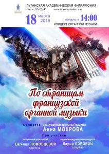 18 марта в 14:00 – концерт органной музыки «По страницам французской органной музыки». Солистка – заслуженная артистка Украины Анна Мокрова. С участием заслуженной артистки ЛНР Евгении Ломовцевой (скрипка) и лауреата международных конкурсов Дарьи Лобовой (сопрано).