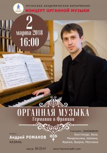 2 марта в 16:00 – концерт органной музыки «Органная музыка Германии и Франции». Солист – Андрей Романов (г. Казань).