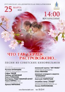 25 марта в 14:00 – концертная программа «Что так сердце растревожено» (Песни из советских кинофильмов). С участием ведущих солистов и коллективов филармонии.