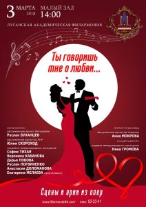 14:00 (малый зал) камерный концерт «Ты говоришь мне о любви» (сцены и арии из опер). С участием ведущих солистов филармонии. Концертмейстер – лауреат международных конкурсов Нина Громова. Лектор-музыковед – заслуженная артистка Украины Анна Мокрова. Луганская академическая филармония