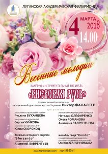 14:00 концерт камерно-инструментального ансамбля «Киевская Русь» «Весенние мелодии». Художественный руководитель – заслуженный деятель искусств Украины Виктор Фалалеев. С участием ведущих солистов и коллективов филармонии.Луганская академическая филармония
