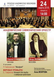14:00 концерт академического симфонического оркестра. Мировая премьера! С.Гаврилов Концерт для трубы с камерным оркестром. Дирижер – Игорь Разумовский (г. Москва). Солист – Сергей Стрищенко (труба, г. Москва).Луганская академическая филармония