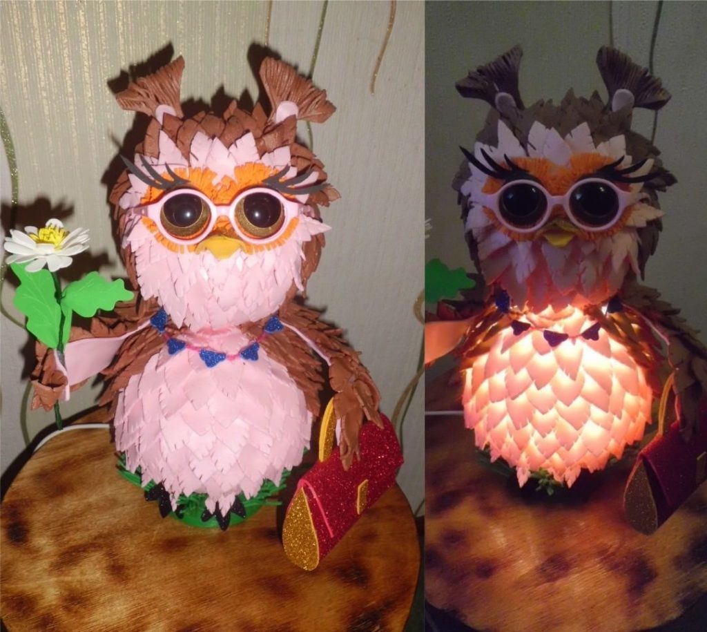 - Моя дочка Ксения боится темноты, как и многие детки. И первая моя работа была именно для нее. Так как Ксюша любит сов, то именно ее я и сделала. Единственное пожелание у дочки было, чтобы не светились глаза. И я сделала так, чтобы светился только живот.