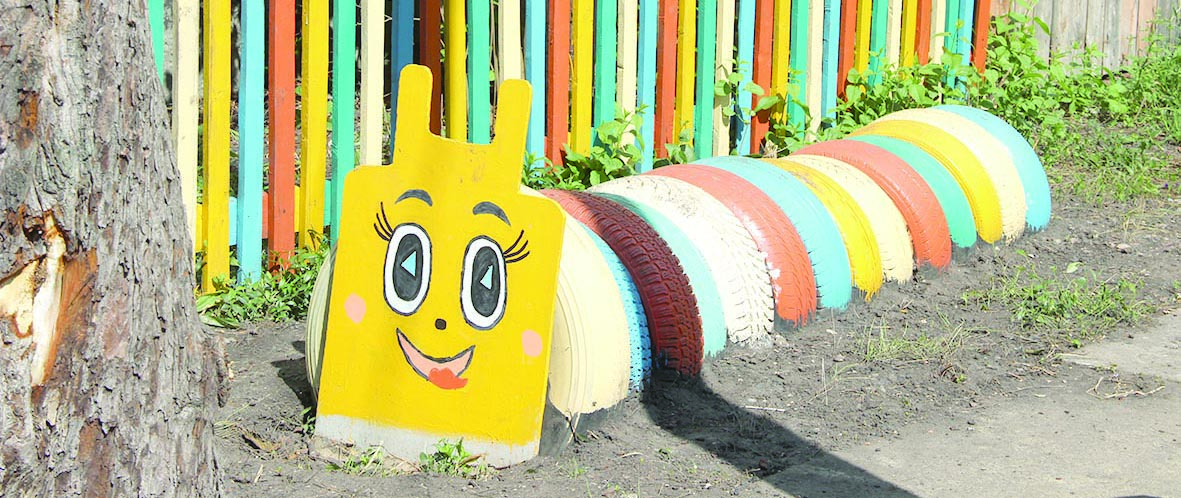 Здесь и правда чего только нет: качели, песочница, сделанные оригинальные цветы из пластмассовых бутылок и яркое солнышко. Однако больше всего из декоративных элементов внимание привлекает необычная клумба, сделанная из нескольких шин, и раскрашенная, как мультипликационный герой миньон.