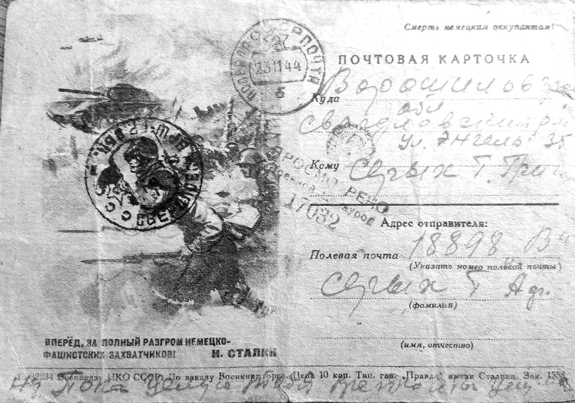 Здравствуй дорогой мой сынок Гена. Сегодня я получил твое письмо и открытку, которые писаны 7.11.1944., в котором вы приглашаете меня к себе на праздник 27 годовщины Октябрьской революции. Сыночек ты хорошо знаешь, что мне надо готовить себя и моих бойцов к решительному штурму Германии, а также мы скоро будем вместе с тобой с родной нашей мамунчиком и дорогим Ирунчиком. Да притом у нас есть … Толик. Гена ты спрашиваешь кто мой первый друг в бою. Друг мой в бою все мои бойцы, которые верны Родине и приказам моим. Я вообще войсковой командир. Ну пока целую тебя крепко, а ты целуй маму.