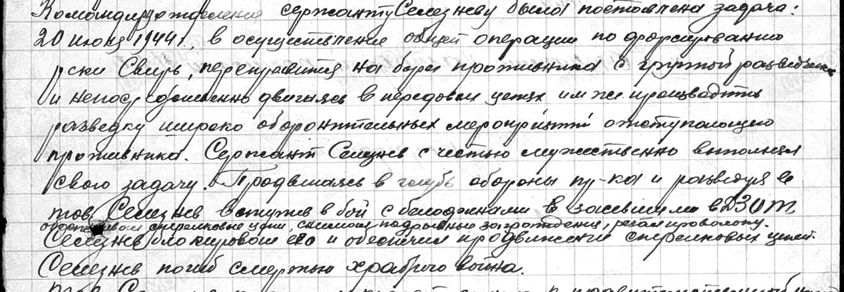 Как свидетельствует полевая тетрадь: «Командиру отделения сержанту Селезневу была поставлена задача 20 июня 1944 года в осуществлении общей операции по форсированию реки Свирь. С группой разведчиков в передовых цепях он переправился на берег противника. Им же производилась разведка широко оборонительных мероприятий отступавшего противника. Сержант Селезнев с честью, мужественно выполнил свою задачу. Продвигаясь вглубь обороны противника, Федор Селезнев резал проволоку, и снимал подрывные заграждения, тем самым блокировал его, обеспечив продвижение советских стрелковых цепей. Сержант Селезнев вступил в бой с фашистами, засевшими в ДЗОТ, и погиб смертью храброго воина».
