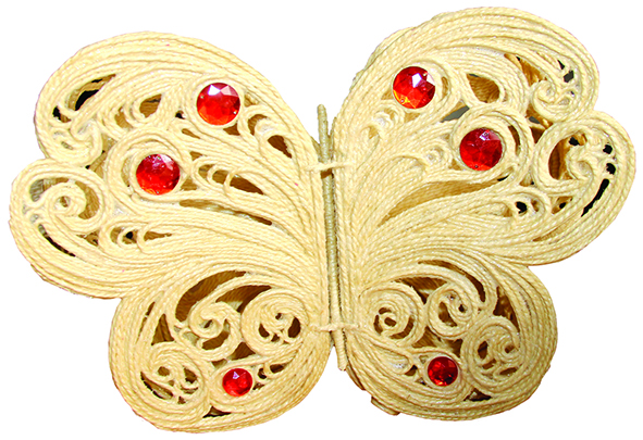 Идеи я находила в интернете, а там их огромное множество – каких только нет. Главное – нужный материал приобрести и все. Для своих поделок я использую джутовые нитки, полимерный клей. Пробовала работать с горячим клеем, используя пистолет, но не совсем красиво получается. Для создания определённой формы нужна проволока. Вот для шкатулки в виде бабочки я ее использовала, чтобы сделать каркас. Также картон нужен и материал для декорирования. Ваза у меня сделана из пластмассовой бутылки из-под шампуня.
