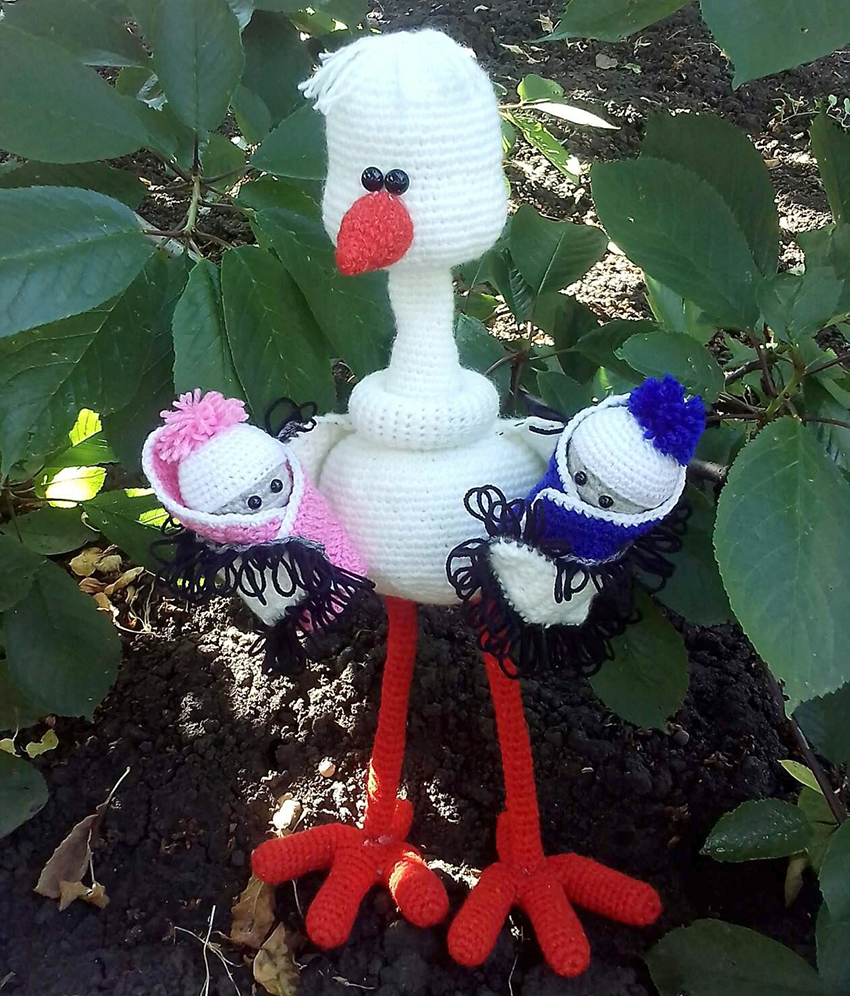 У меня очень много игрушек, и все они очень дороги мне, однако есть самая любимая. Это аист, который держит два конвертика с детками, в одном из них девочка, в другом мальчик. Такая идея у меня появилась, когда я родила двойняшек, но связала его только спустя десять лет. Он получился большой, каркасный, с крыльями и ножками на проволоке, и даже двигается.