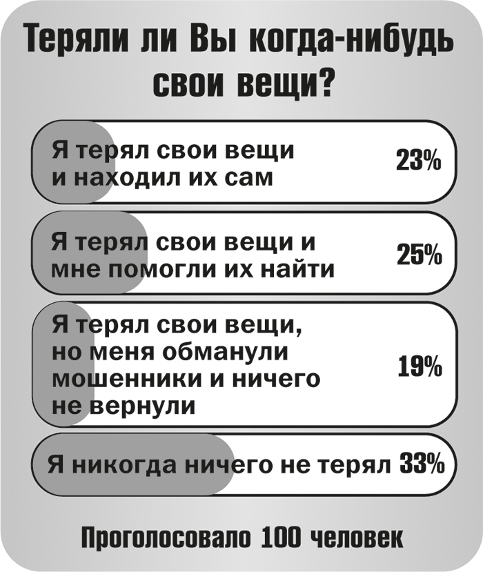 К сожалению, уже не первый день существует проблема, которую никак нельзя искоренить. Люди теряли, теряют и будут терять свои любимые, нужные вещи. Судя по рассказам наших сограждан, которым удалось найти потерянное имущество самостоятельно либо с чьей-то помощью, среди нас есть много добрых людей, готовых помочь даже незнакомому человеку. Безусловно, нужно быть внимательными к своим вещам, но даже в случае их утери, самое главное – не теряться, а сразу же начинать поиски, и тогда есть все шансы их найти.