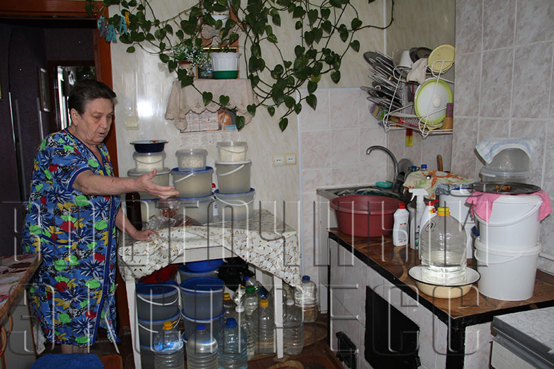 Самое печальное, что в восьми двухэтажных домах проживают не только семьи с маленькими детьми, а еще и 10 инвалидов. И эти люди вынуждены искать, где взять воду, и тех, кто им ее принесет. Наталья Васильевна – инвалид второй группы, с трудом передвигается по квартире и совсем не выходит на улицу. Эта пожилая женщина живет одна, у нее нет детей, и воду ей приносит единственная племянница, иногда социальный работник. А когда девчонки устают, она нанимает за деньги кого-то из ребят. В день нашего визита у Натальи Васильевны вся квартира с самого порога была заставлена наполненной тарой: пластмассовых ведер я насчитала около 30 штук, и более 50 баклажек. И это, не беря во внимание 100-литровый бак и емкость в ванной на 300 литров. Однако посуду пенсионерка моет в нескольких водах: от жира избавляется дождевой, затем перемывает чистой. Но, несмотря на такие трудности, она помогает стирать вещи соседке Ларисе, такой же одинокой пенсионерке.