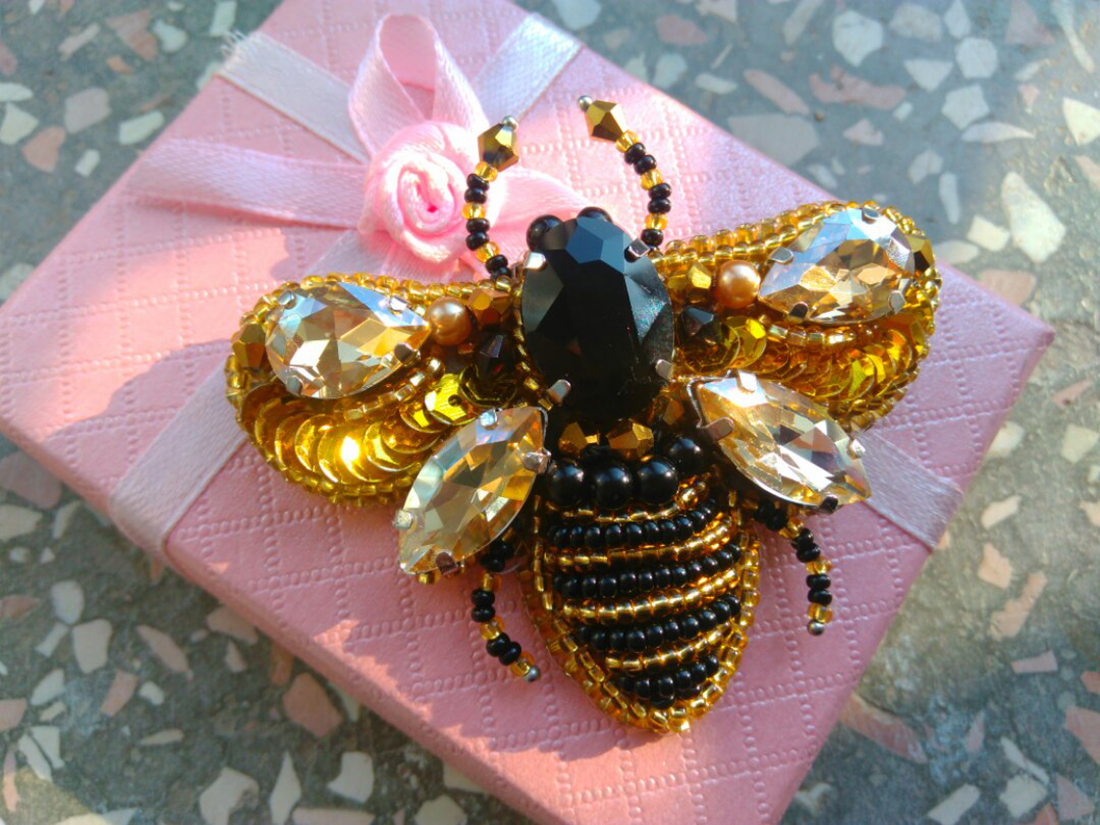 Я была подписана на многие творческие группы в соцсетях, в которых девочки делились своими работами. Однажды на глаза попались брошки в форме бабочек, птичек, – уж очень они мне понравились. Я прямо загорелась идеей попробовать сделать что-то подобное. Первые труды не оправдали ожидания: то криво, то не особо похожие на птичек. Но с опытом, когда уже набила руку, поняла, как поведет себя тот или иной материал, с которым работаешь, с каждым разом выходило все лучше. Мне удалось раздобыть достаточно редкий у нас в городе материал – канитель, и я взялась делать розу. Получается очень красиво. В настоящий момент делать брошки мне нравится больше всего.