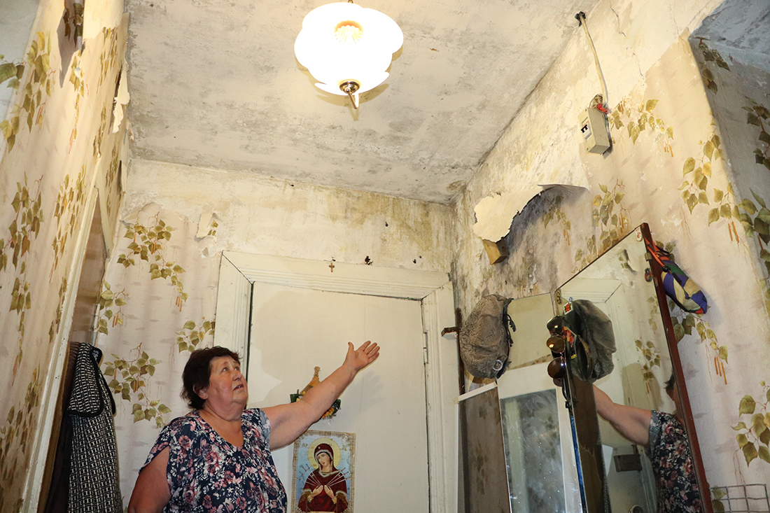 – В малейший дождь по стенам начинает течь вода, – пожаловалась она, указывая на пятна сырости на обоях в комнате. – Стены, потолок и даже пол трескаются от влаги, из-за чего я не могу сделать ремонт уже больше 20 лет. Повсюду появляются черные пятна – такие условия благодать для плесени. Дышать невозможно. Из-за влаги портится электропроводка, а литой бетонный пол вздувается и разваливается на куски, – в качестве доказательства своих слов Людмила подняла ковер в спальне и голыми руками вытащила из пола кусок бетона. – А еще в квартире стоит сильный запах голубиного помета. Председатель нашего поселка говорит, что помочь ничем не может. Никому до нас нет дела.