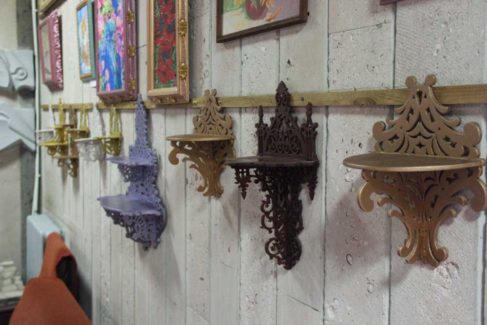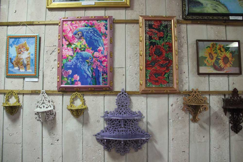Иконы – крестиком, картины – алмазами В четвертую группу я бы выделил многообразие декоративных полочек, растянувшихся на стене напротив. Все тот же легкий и невесомый стиль резьбы. Все та же узорчатая вязь могут надолго заставить всматриваться в хитросплетение узоров.