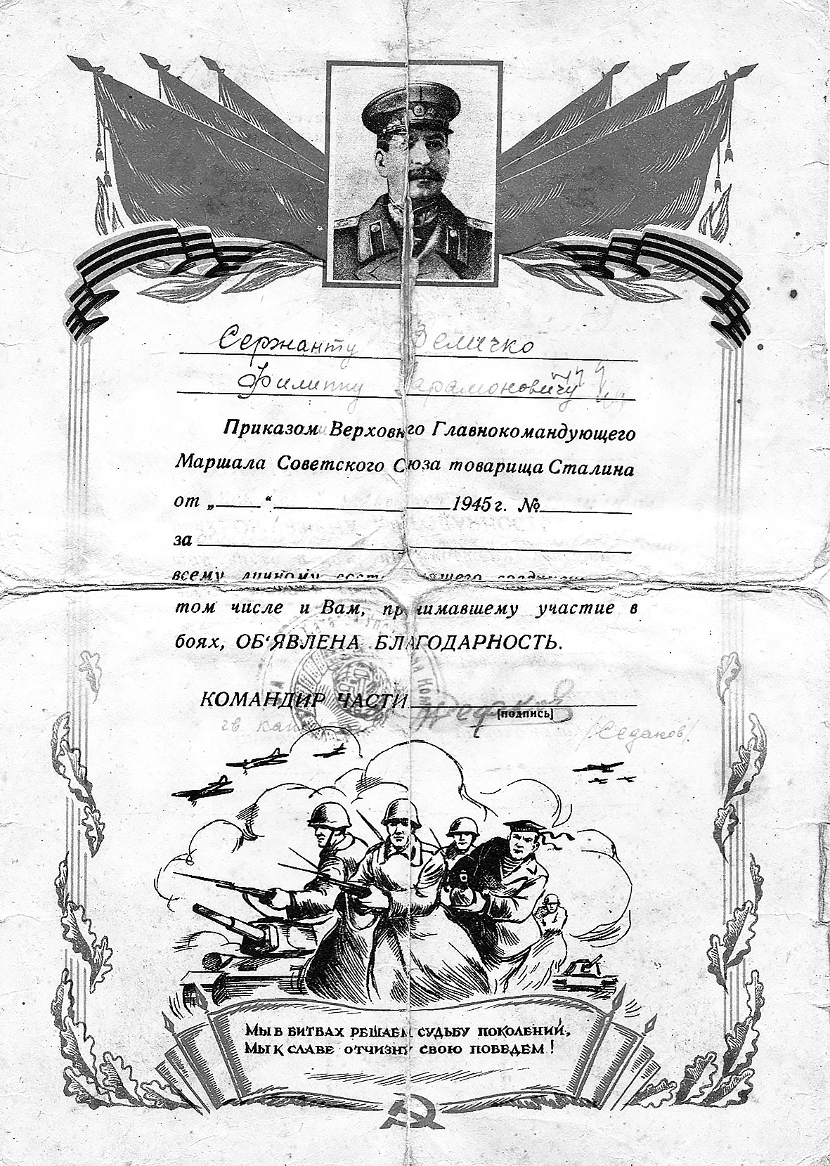 Особой гордостью для отца были медали «За взятие Берлина» и «За Победу над Германией в Великой Отечественной войне 19411945г.». В мае 1945 года сержанту Величко Ф.П. от Верховного Главнокомандующего товарища Сталина была объявлена благодарность. Домой возвратился отец только в сентябре 1946 года, потому что нужно было поддерживать порядок в Германии: он служил в Берлине, Штендале, Магдебурге.