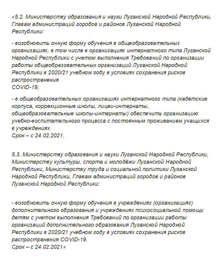 16 февраля 2021 года прошло заседание ЧСПК при Правительстве ЛНР, где члены комиссии приняли решение о возобновлении стандартной очной формы обучениях в школах, организациях интернатного типа и учреждениях дополнительного образования.