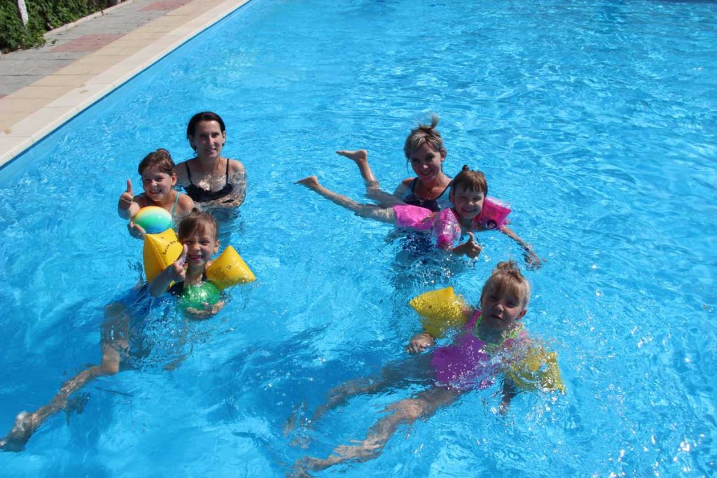 В большой бассейн допущены только те детишки, которые действительно умеют плавать, потому что глубина его от 150 см, - малышам будет с головой, так что ребятни было не очень много. Несмотря на нарукавники, которые надежно страхуют ребенка, в воде за детьми нужен «глаз да глаз». Компания у нас подобралась отличная – игра на воде с мячом показала, что команда по синхронному плаванию готова, и подружились мы крепко. Везде, с кем бы мы ни общались – встречались с одним позитивом: дети, воспитатели, обслуживающий персонал, директор.