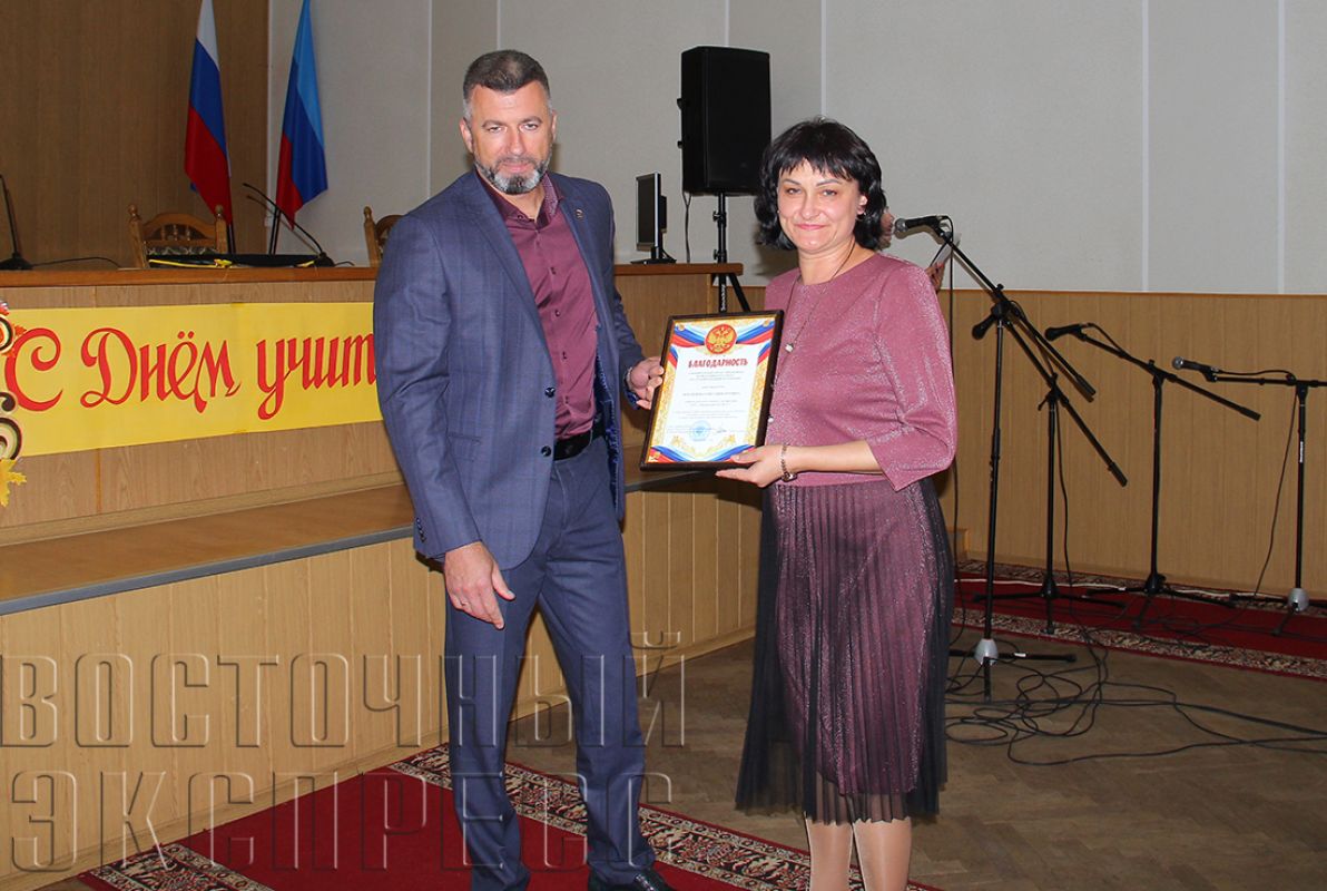 Первые, самые трогательные поздравления учителя и воспитатели получили от маленьких свердловчан – воспитанников яслейсада «Ромашка». Затем к педагогам обратился глава администрации Андрей Сухачев: «В вашем лице хочу поздравить всех учителей города и района, – сказал Андрей Валерьевич. – Я уверен, что наши дети с малых лет находятся в правильных руках. Мы прошли тернистый путь, но теперь учим наших детей на родном языке и нашей истории. Глядя на то, какие результаты показывают учащиеся свердловских школ, мы однозначно понимаем, что у нас есть будущее. Оно светлое и ясное, и я уверен, что скоро станет мирным!».