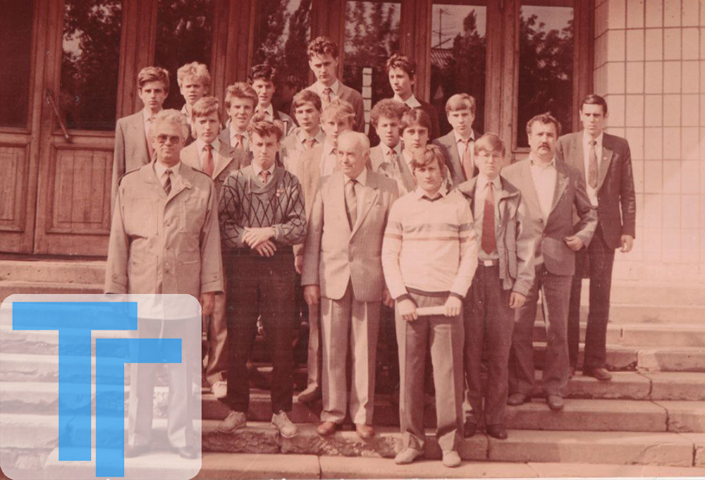 Коллектив преподавателей и учеников, 80-е годы (на фоне ПТУ-12)