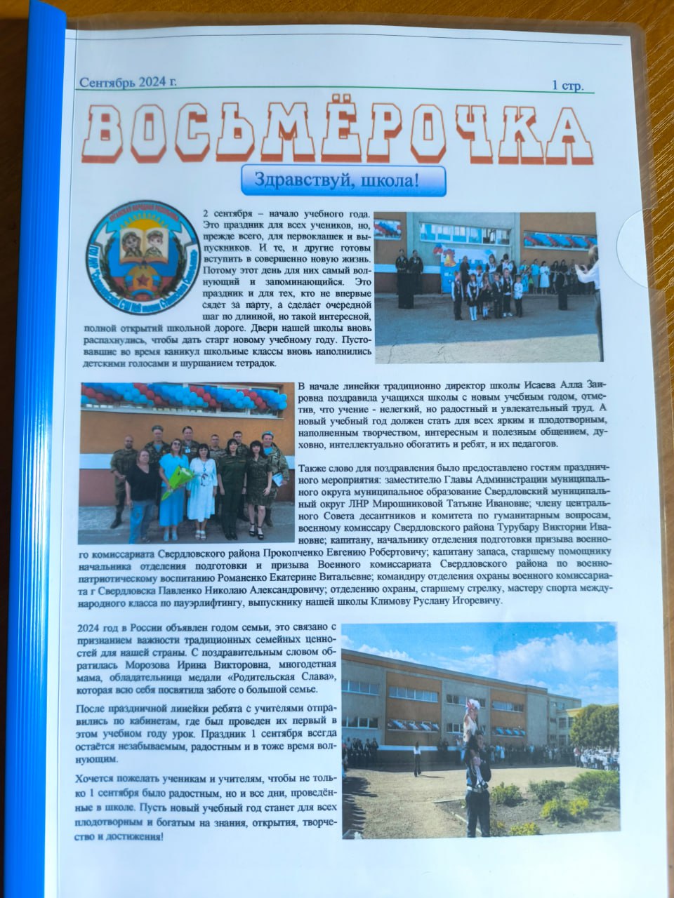 В заключение встречи традиционное фото на память и красивые подарки от учащихся, среди них газета «Восьмёрочка, где запечатлены насыщенные школьные будни и праздники, в которых объединяются ученики, администрация, учителя и родители.