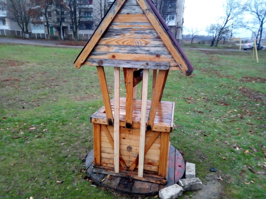 Открытый канализационный люк был перекрыт, на него установили декоративный колодец в виде сруба.