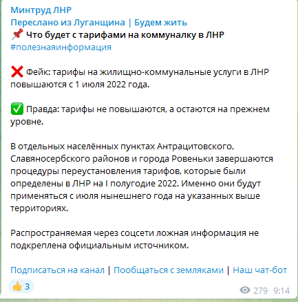 «Фейк: тарифы на жилищно-коммунальные услуги в ЛНР повышаются с 1 июля 2022 года.