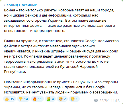 «Война – это не только ракеты, которые летят на наши города, но и шквал фейков и дезинформации, которыми нас закидывают со стороны Украины. Главным оружием, к сожалению, становится Google: количество фейков и экстремистских материалов здесь только увеличивается, и никакие штрафы и решения суда для них роли не играют. Компания ведет целенаправленную пропаганду терроризма и экстремизма, а значит – просто ни во что не ставит своих пользователей из Луганской Народной Республики», - написал Пасечник.
