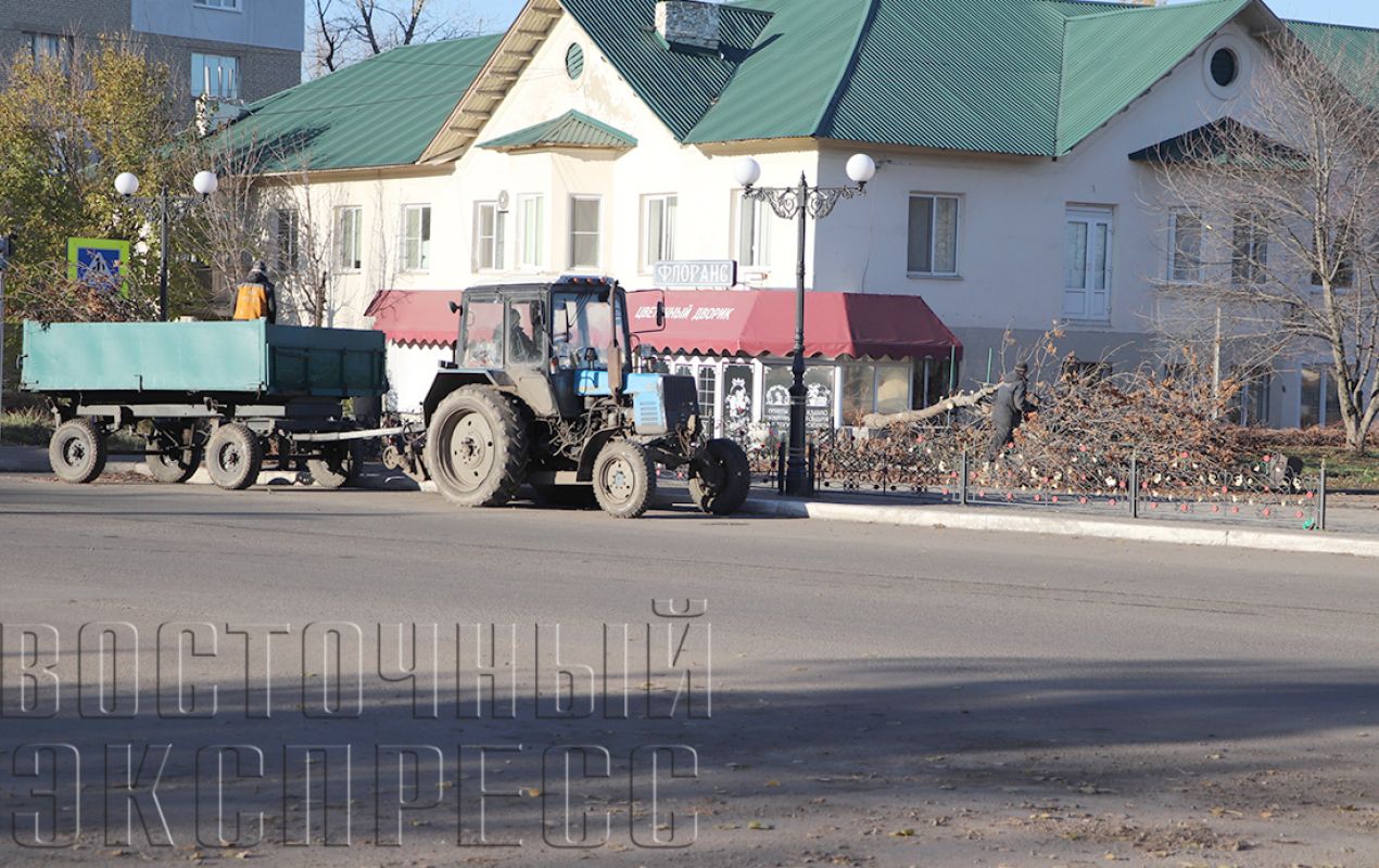 Задача у них стояла непростая: нужно было спилить и раскряжевать засохшее дерево, однако на момент, когда наш корреспондент проходил мимо, работа близилась к концу. Огромные ветки уже грузили на лафет трактора, а площадь сквера сразу приобрела более ухоженный вид.