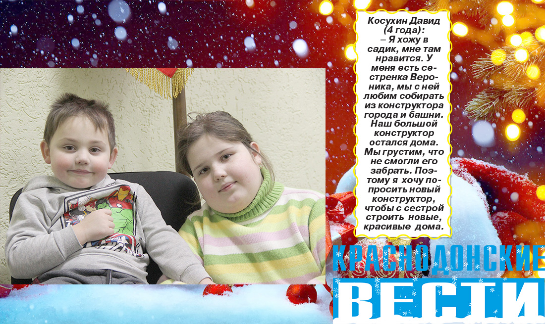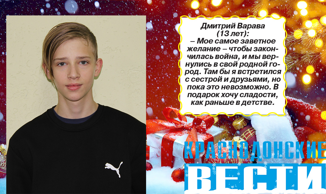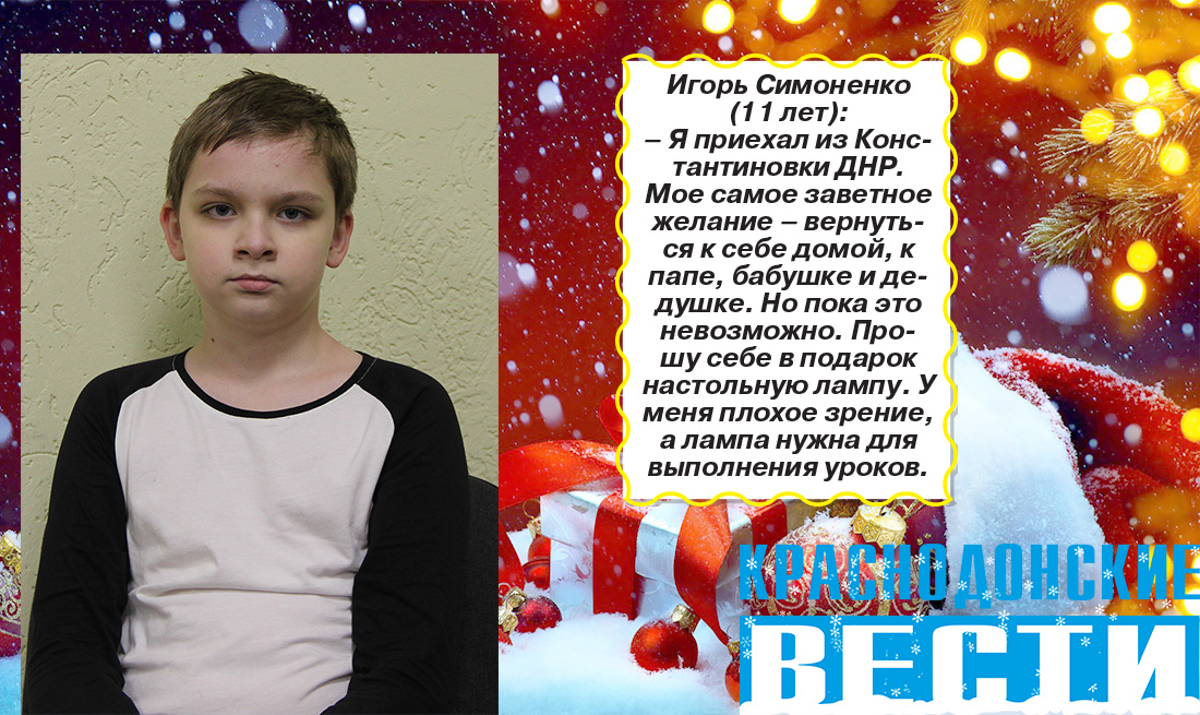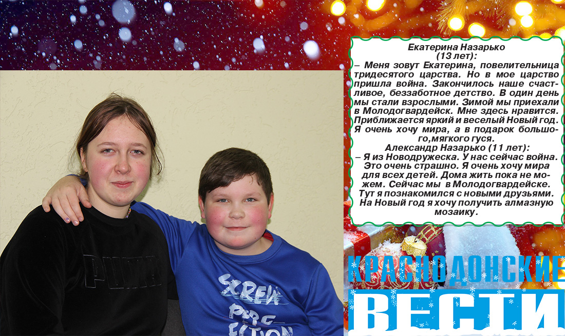 Совсем скоро наступит самая волшебная пора года – новогодние праздники. В эти дни дети верят в чудеса и ждут исполнения своих сокровенных желаний. В этом году среди нас есть особенная категория юных жителей города – это дети вынужденных переселенцев. Они приехали сюда, потому что в их дома постучала война. Мальчики и девочки многое пережили. К счастью, сейчас они в безопасности. Их радушно принял наш город. Часть детей вместе со своими близкими проживают в санатории «Солнечный» и в общежитии № 6 города Молодогвардейска. Некоторые живут в съемных квартирах и налаживают быт в новых условиях.