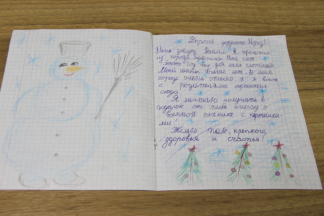 В канун праздников дети переселенцев тоже написали письма доброму волшебнику. Как оказалось, они мечтают о самом главном – мире в своих родных городах. Кроме этого, у них есть и такие простые желания, как новая игрушка, вкусные сладости, красивая пижама. Вот что писали дети в своих посланиях главному волшебнику года.