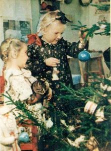 Ветки или деревца, обычно, были высотой чуть больше метра, поэтому подставкой служила табуретка с вырезанным в крышке отверстием. Табурет маскировали куском белой простыни, а под елкой укладывали вату – имитатор снега. Затем начинался процесс украшения.