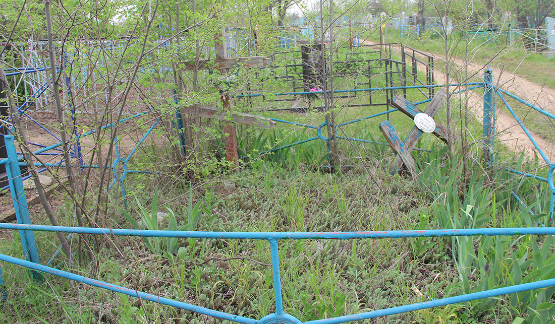 В одной из таких оград, судя по обилию наград на фотографии, похоронен уважаемый человек. Скорее всего, передовик производства или ветеран войны или труда. Умерла женщина в 2002 году. Судя по старому деревянному кресту и отсутствию гробницы, за могилой долгое время никто не ухаживает. Земля здесь просела. На могильном холме растет куст сирени. Компанию ему составляет обычная сорная трава.