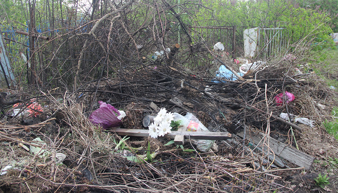 На краю поля, что соседствует с погостом, вырыто несколько ям для мусора. Но, несмотря на это, стихийных свалок здесь тоже хватает. Мусор оставляют там, где хотят. Не желая идти к мусорной яме, жители складируют ветки, сухие цветы там, где им удобно. В результате мусор рассыпается во все стороны, попадая на другие могилы. Его нагромождения мы увидели тут же, пройдя немного вглубь кладбища.