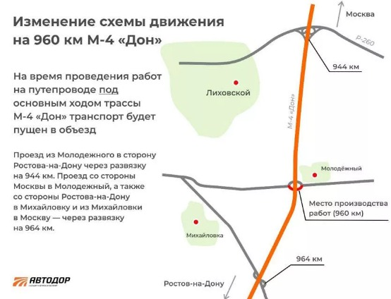 Таким образом, с 30 сентября весь транспорт будет ездить в объезд через развязку на 944 километре. Со стороны Москвы водителям предлагают дорогу в поселок Молодежный в направлении Ростова-на-Дону. Развернуться же им будет можно через транспортную развязку на 964-м километре дороги.