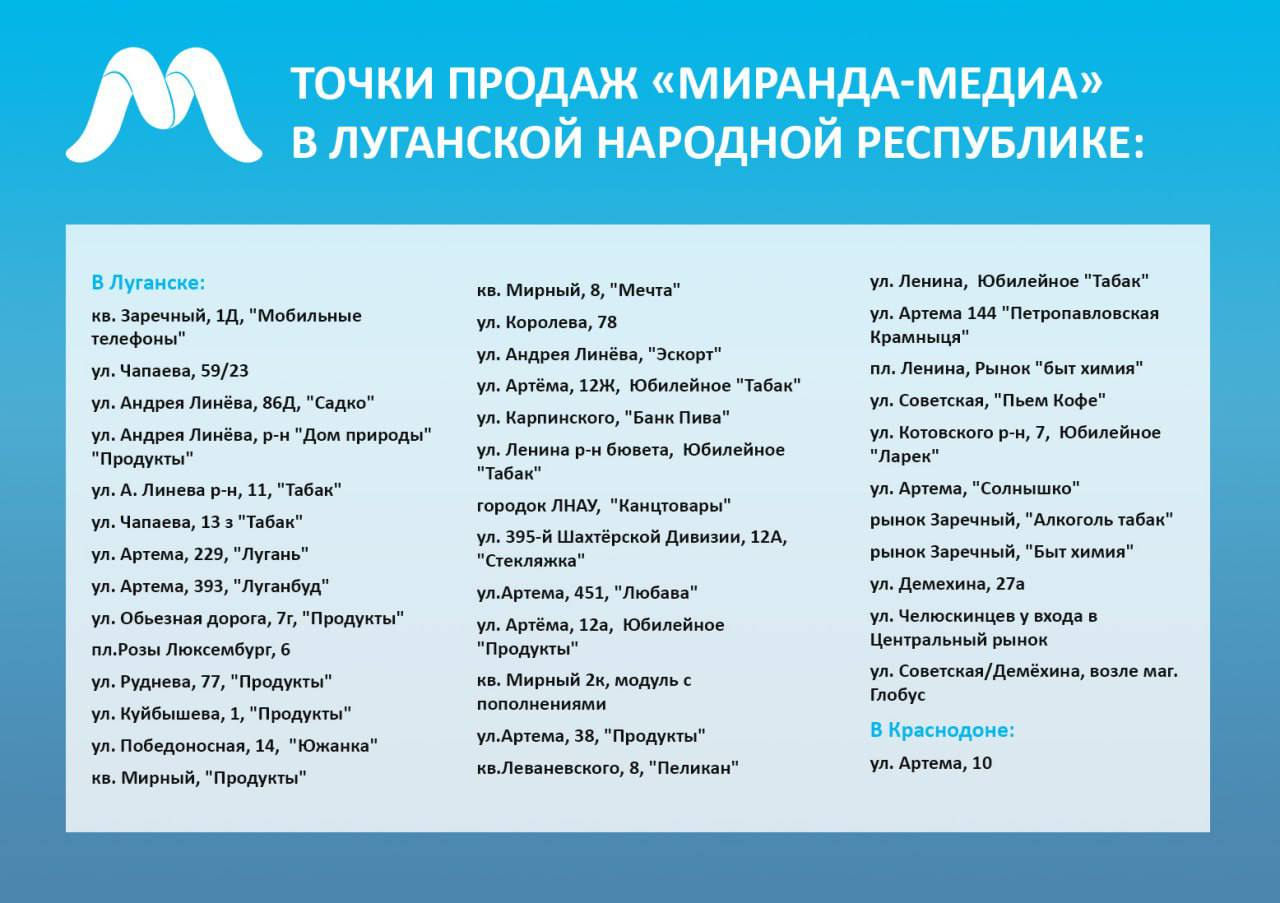Новый мобильный оператор «Миранда-медиа» 1 ноября откроет на территории Луганской Народной Республики 40 точек продажи сим-карт, 39 из которых расположены в Луганске и одна – в Краснодоне.