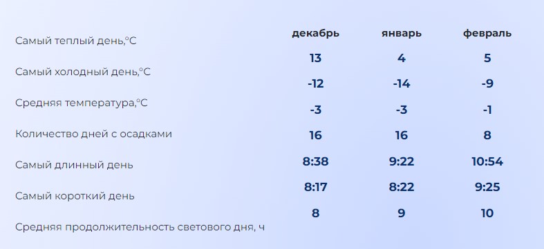 Зима 2023-2024 неприятно удивит жителей Республики температурными показателями по сравнению с сезоном прошлого года. Дней с осадками будет немного. Средняя температура сезона составит -2°C, что незначительно ниже показателя зимы 2022-2023. Декабрь будет по-осеннему тёплым - в редкие дни температура воздуха будет опускаться ниже -3°C. В первой половине месяца ожидаются дождливые дни, под конец декабря возможен снег, но его выпадет мало, вероятность того, что мы будем встречать Новый 2024 год без него высока.