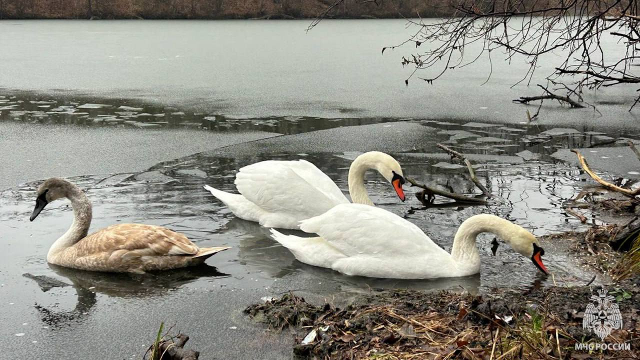 «На водоёме семья лебедей поселилась ещё летом. С холодами птицы не успели улететь в тёплые края. Лёд сковал пруд», - отмечается в опубликованном ведомством сообщении.