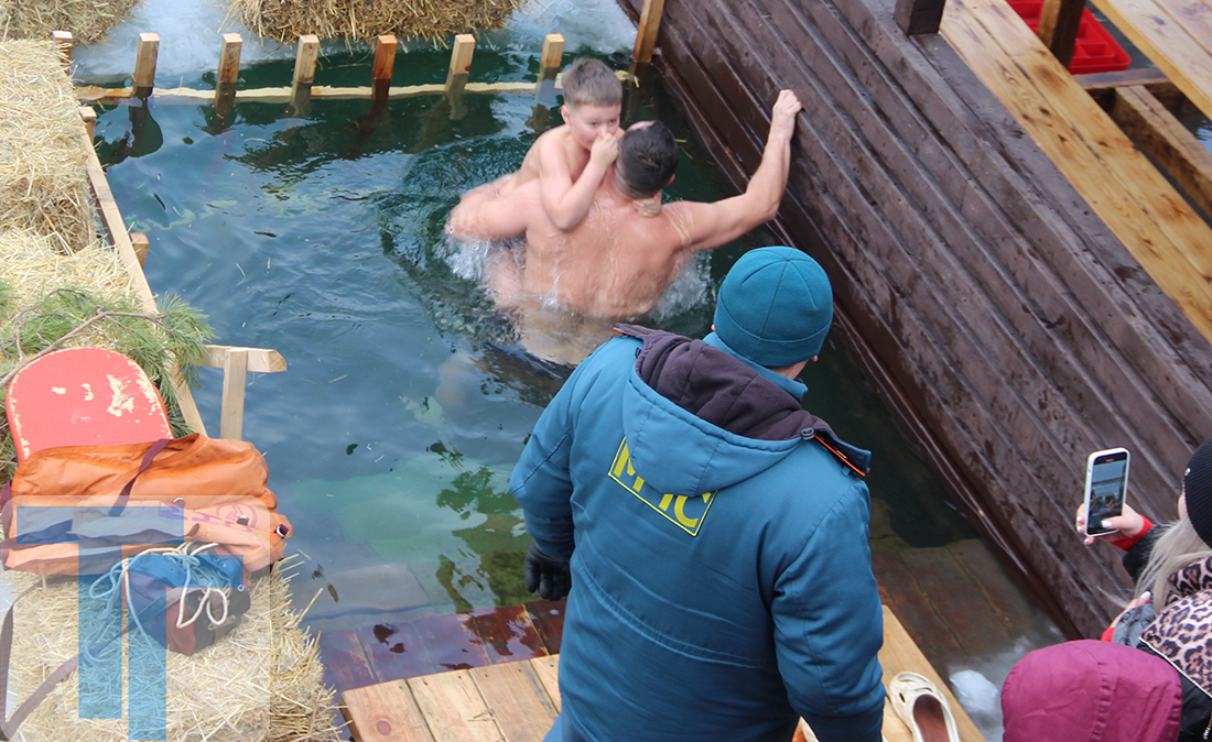 На берегу дежурили сотрудники МЧС, рядом – спецавтомобиль скорой медицинской помощи с бригадой медиков. Чтобы избежать большого скопления людей на льду, сотрудники МЧС просили их подходить к проруби по одному. Желающие окунуться в водоем терпеливо ждали на ступенях и только по команде спасателей подходили к купели. Среди желающих испытать свои силы были как мужчины, так и женщины, и дети. Многие из них подошли к купанию со всей ответственностью – надевали специальные белые рубашки, чтобы погружение проходило согласно существующим канонам.