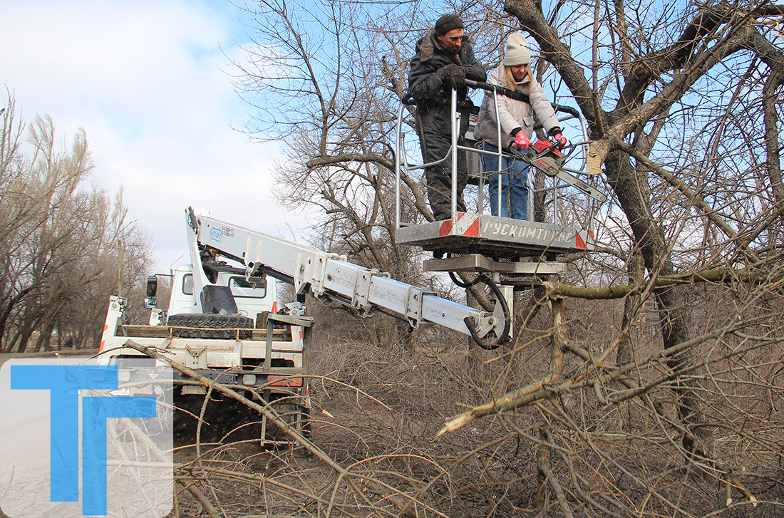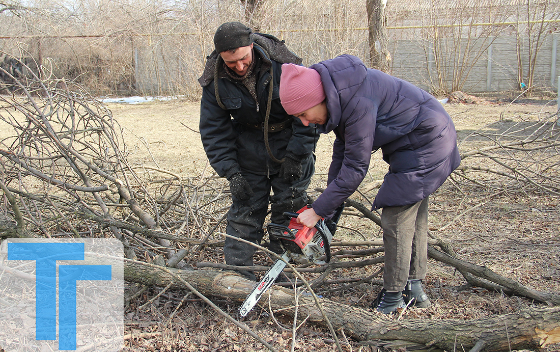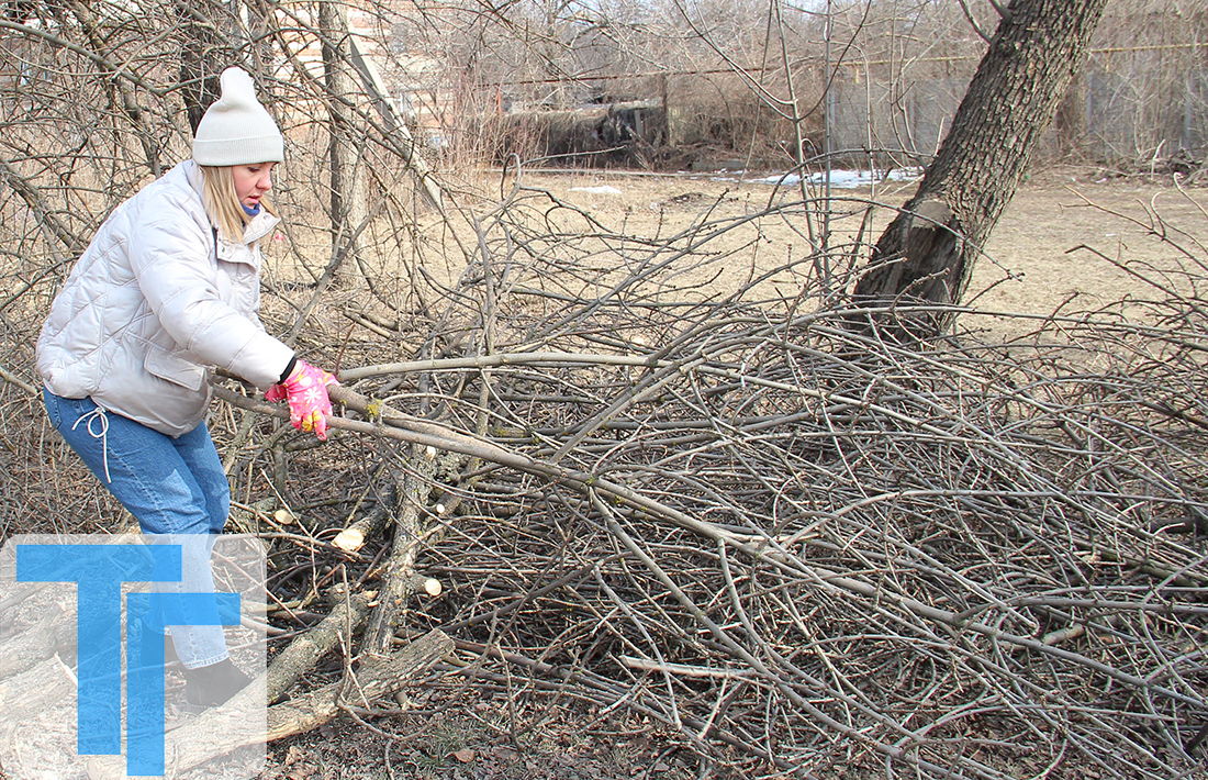 В день нашего визита по графику работы по опилке веток были на улице Лутугина. Как оказалось, бригада вся поделена: одни пилят ветки, другие их убирают. Нам удалось попробовать и то, и другое.
