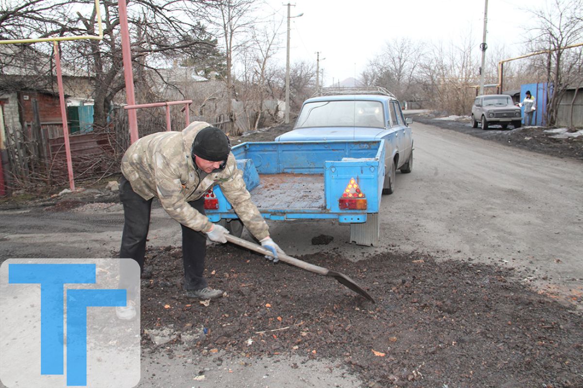Во второй половине пятницы, 15 марта, на улице Ленина в поселке шахты №63 местные жители собственными силами выравнивали и утрамбовывали нарушенную поверхность проезжей части.